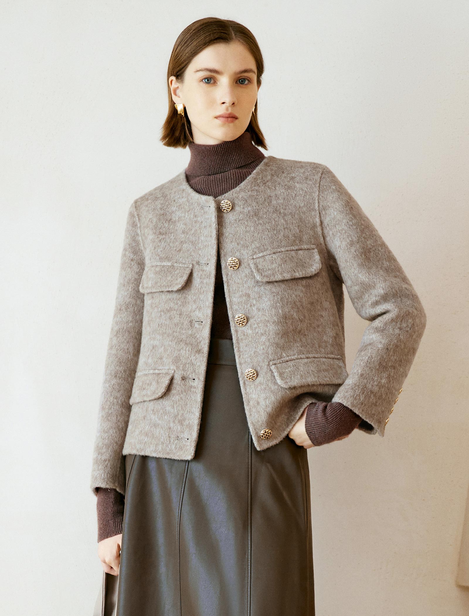 Wool Decorative Pockets Cropped Coats