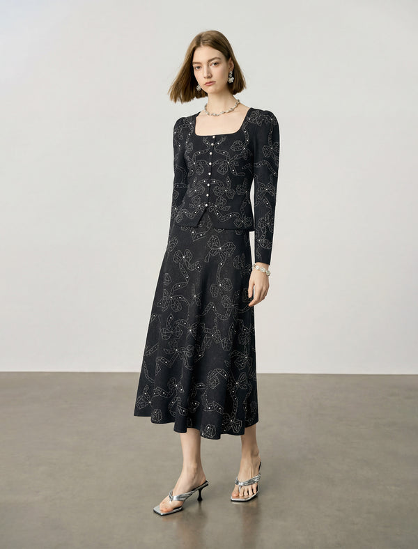 This glamorous black midi skirt features delicate bow patterns outlined in shimmering embellishments, plus a flowy A-line fit for a feminine, dressy look. Its soft knit fabric feels comfortable, while the all-over sparkle adds eye-catching charm. Pair it with the matching blazer top for a cocktail party, or style with a simple blouse for a special dinner. It’s a sophisticated, statement piece that balances elegance and sparkle.